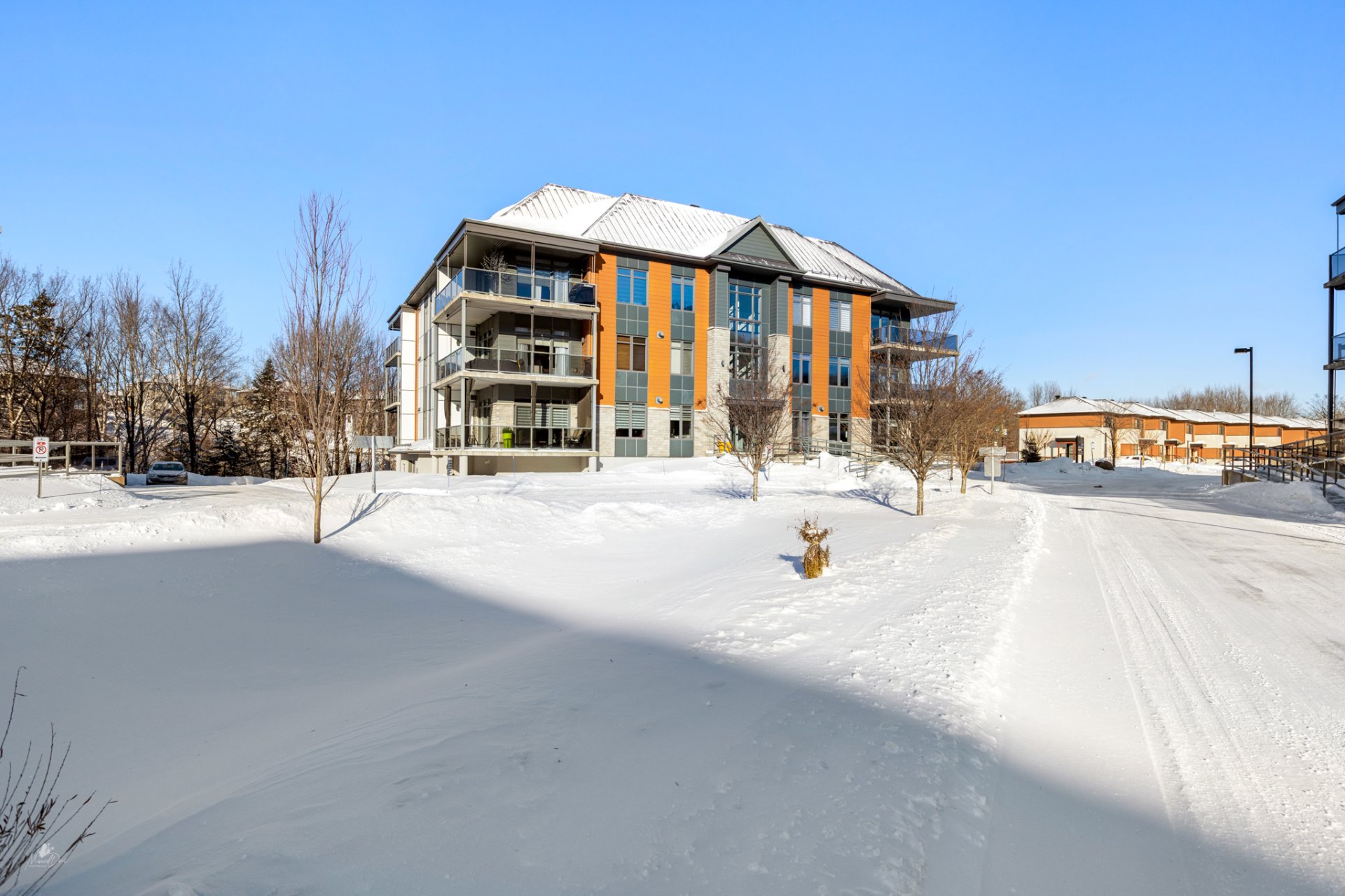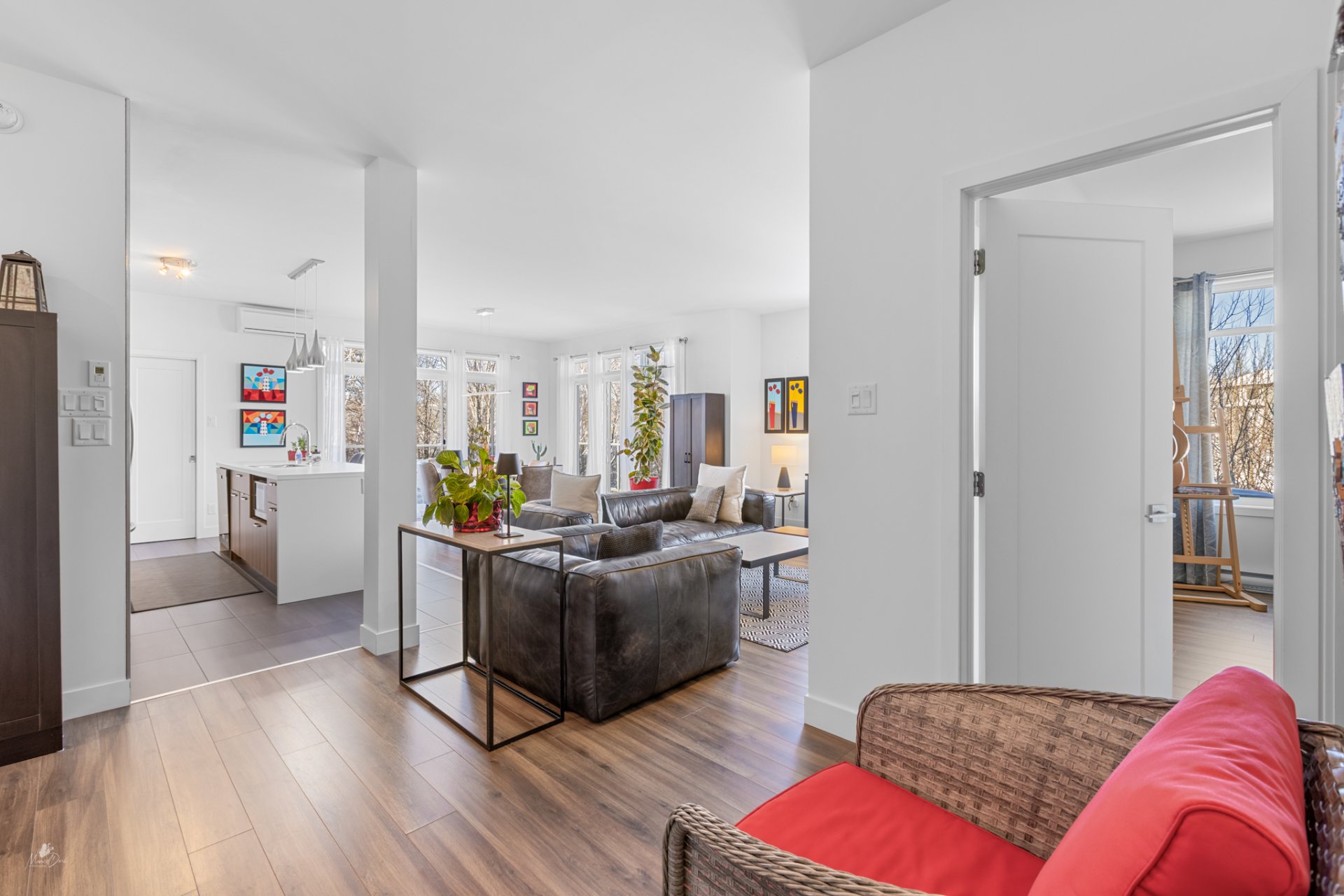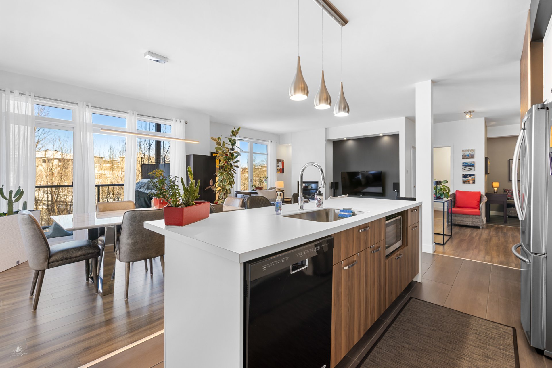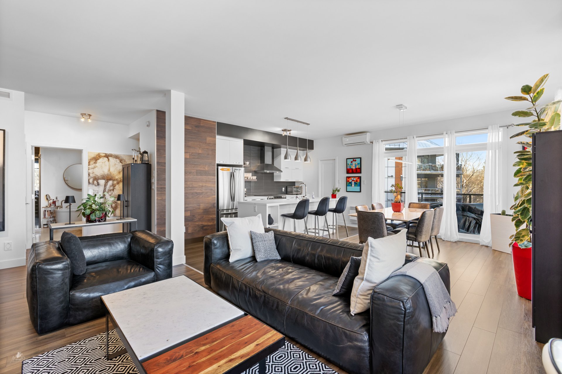 High-end condo on the 2nd floor, modern and bright, featuring an open-concept living space flooded with natural light and a beautiful view of the wooded area. Elegant kitchen with a large central island and propane fireplace in the living room. Spacious primary bedroom and a secondary bedroom with a Murphy bed, maximizing space and comfort. Luxurious bathroom with a freestanding bathtub and glass-and-tile shower, adjacent laundry room, convenient powder room, and optimized storage. Enjoy a private terrace, one garage parking space, and one outdoor parking space. Close to all amenities!