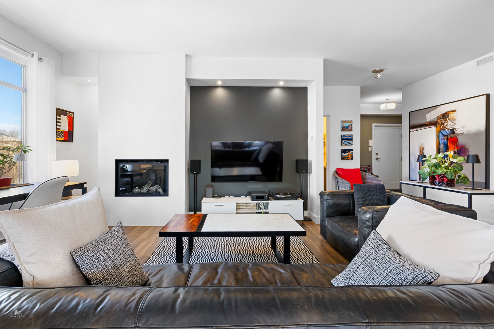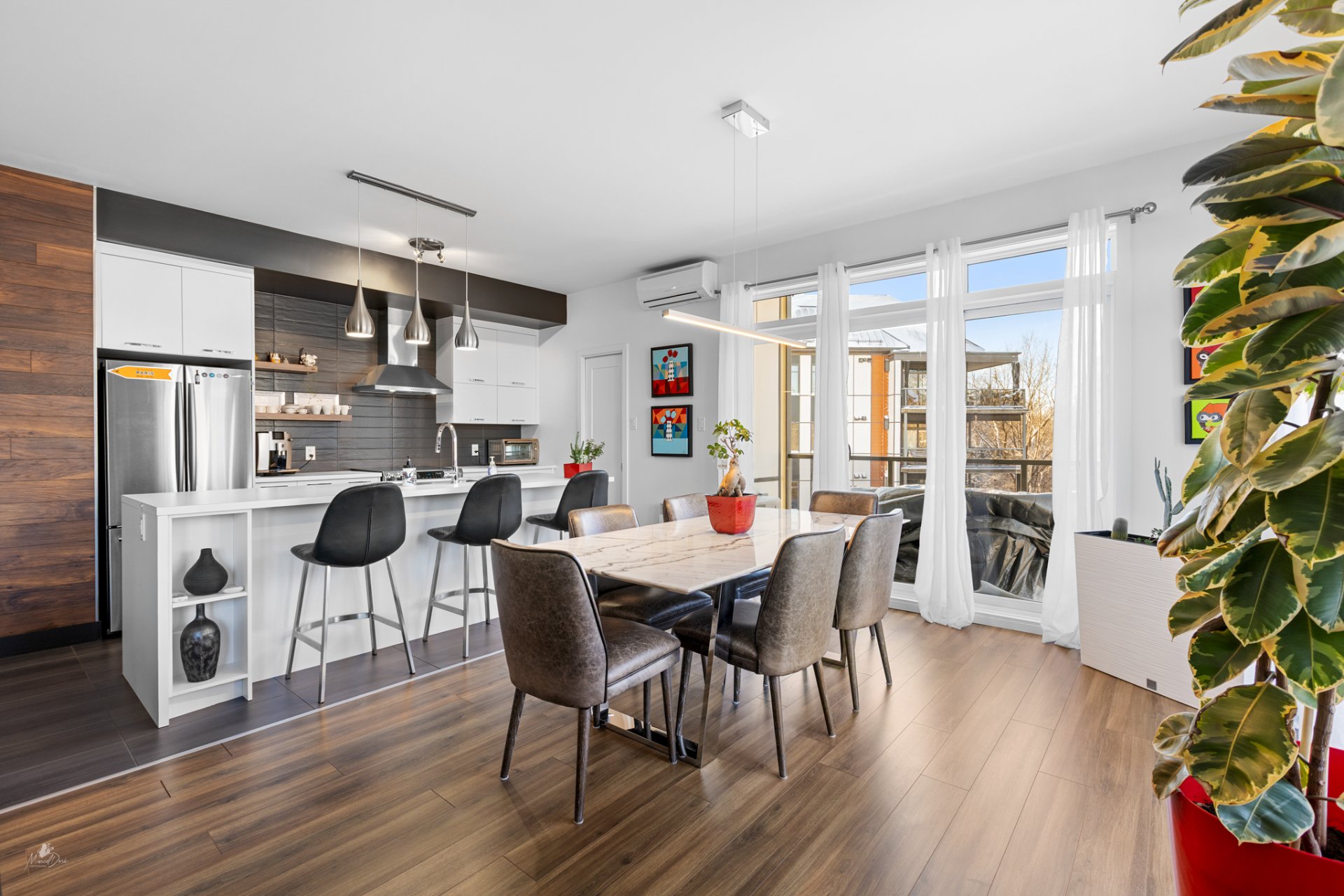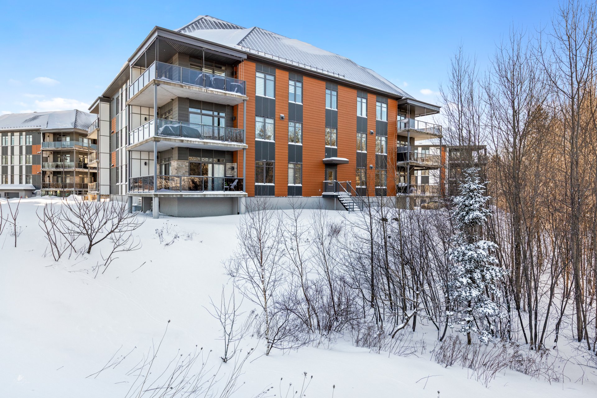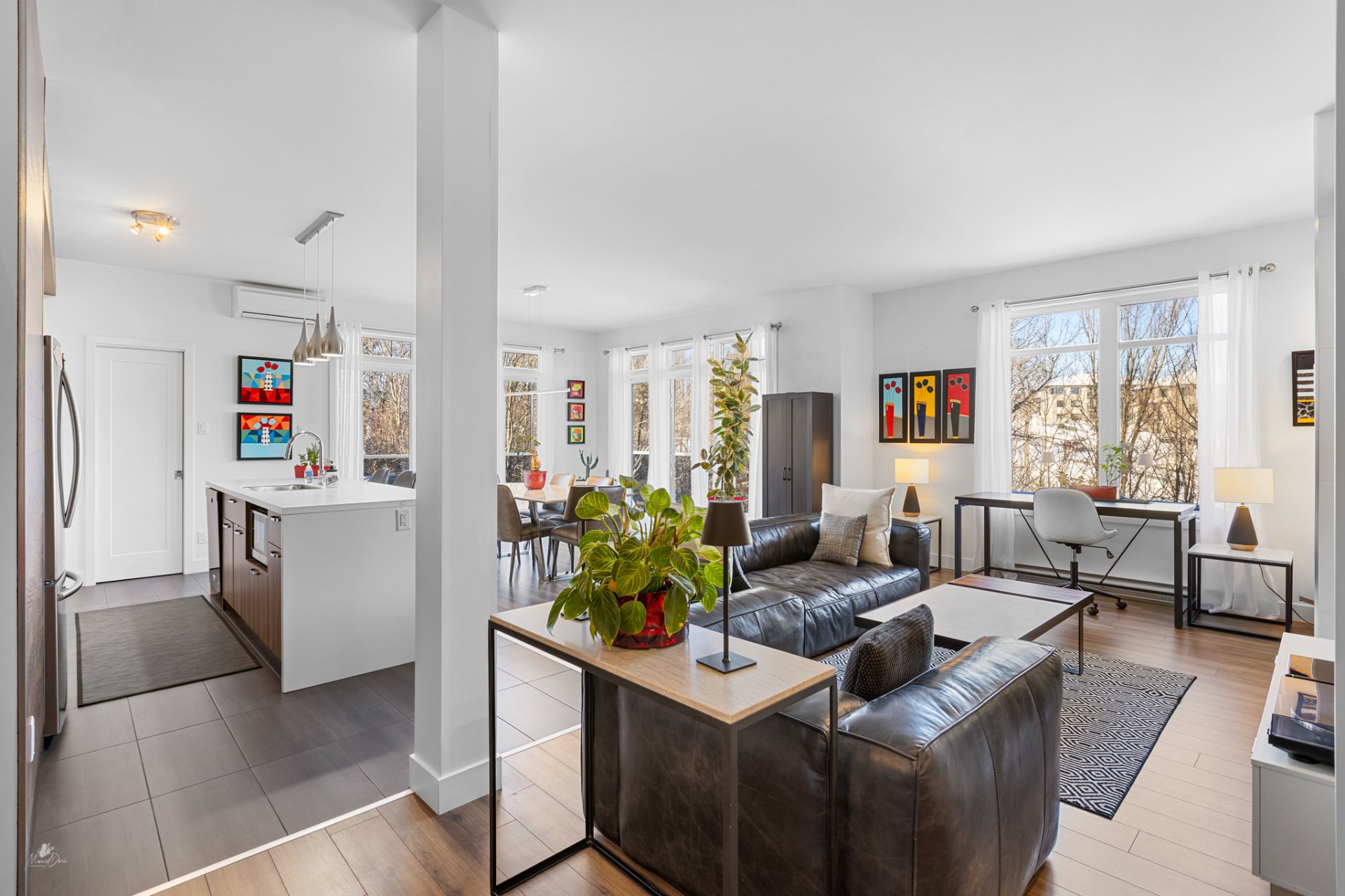 High-end condo on the 2nd floor, modern and bright, featuring an open-concept living space flooded with natural light and a beautiful view of the wooded area. Elegant kitchen with a large central island and propane fireplace in the living room. Spacious primary bedroom and a secondary bedroom with a Murphy bed, maximizing space and comfort. Luxurious bathroom with a freestanding bathtub and glass-and-tile shower, adjacent laundry room, convenient powder room, and optimized storage. Enjoy a private terrace, one garage parking space, and one outdoor parking space. Close to all amenities!