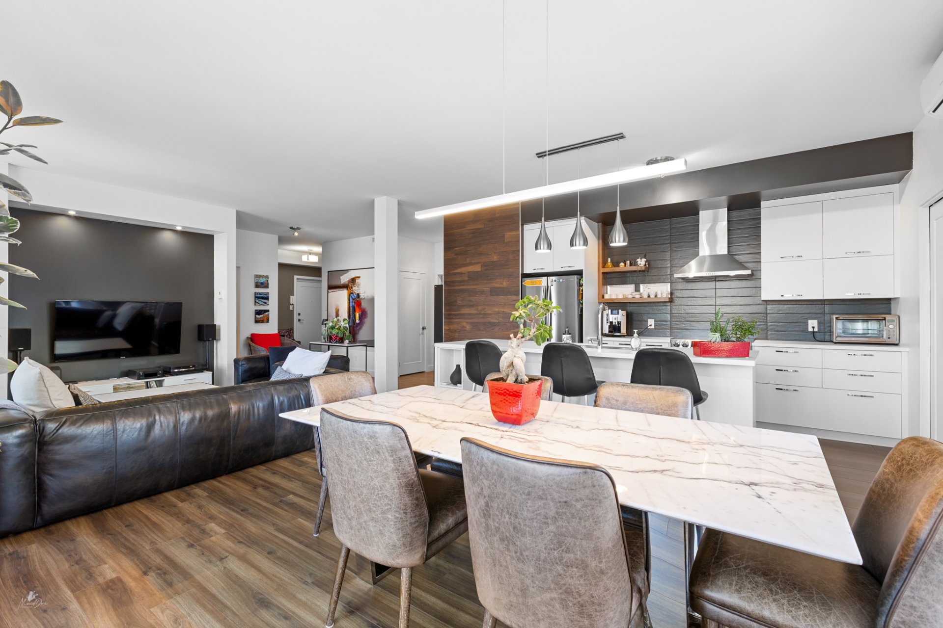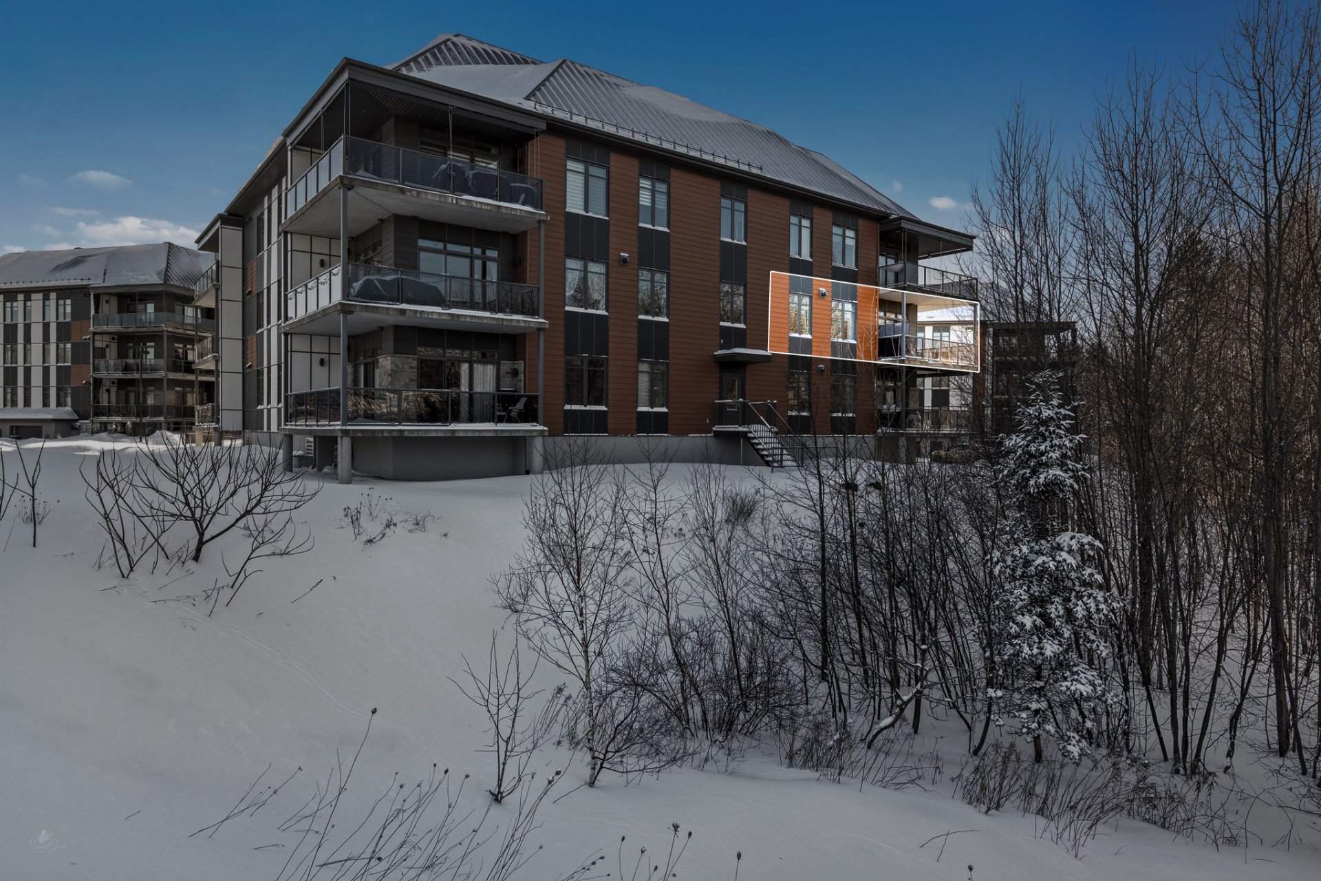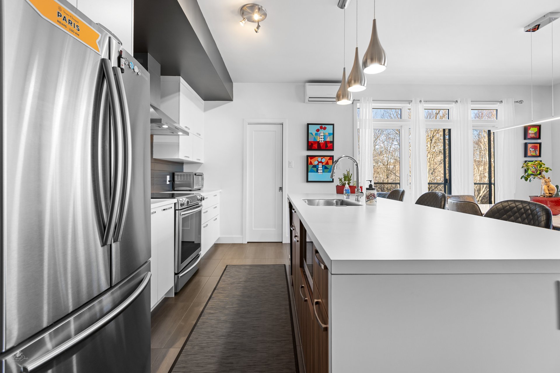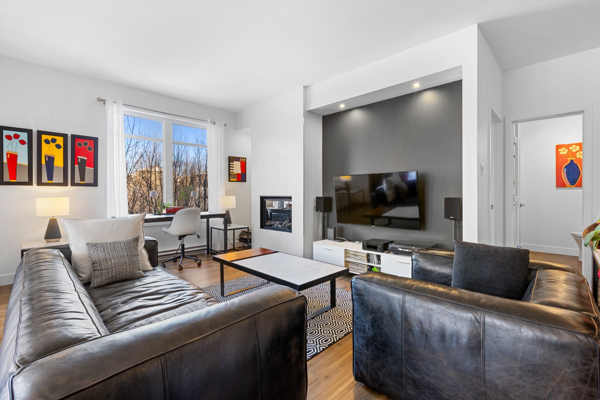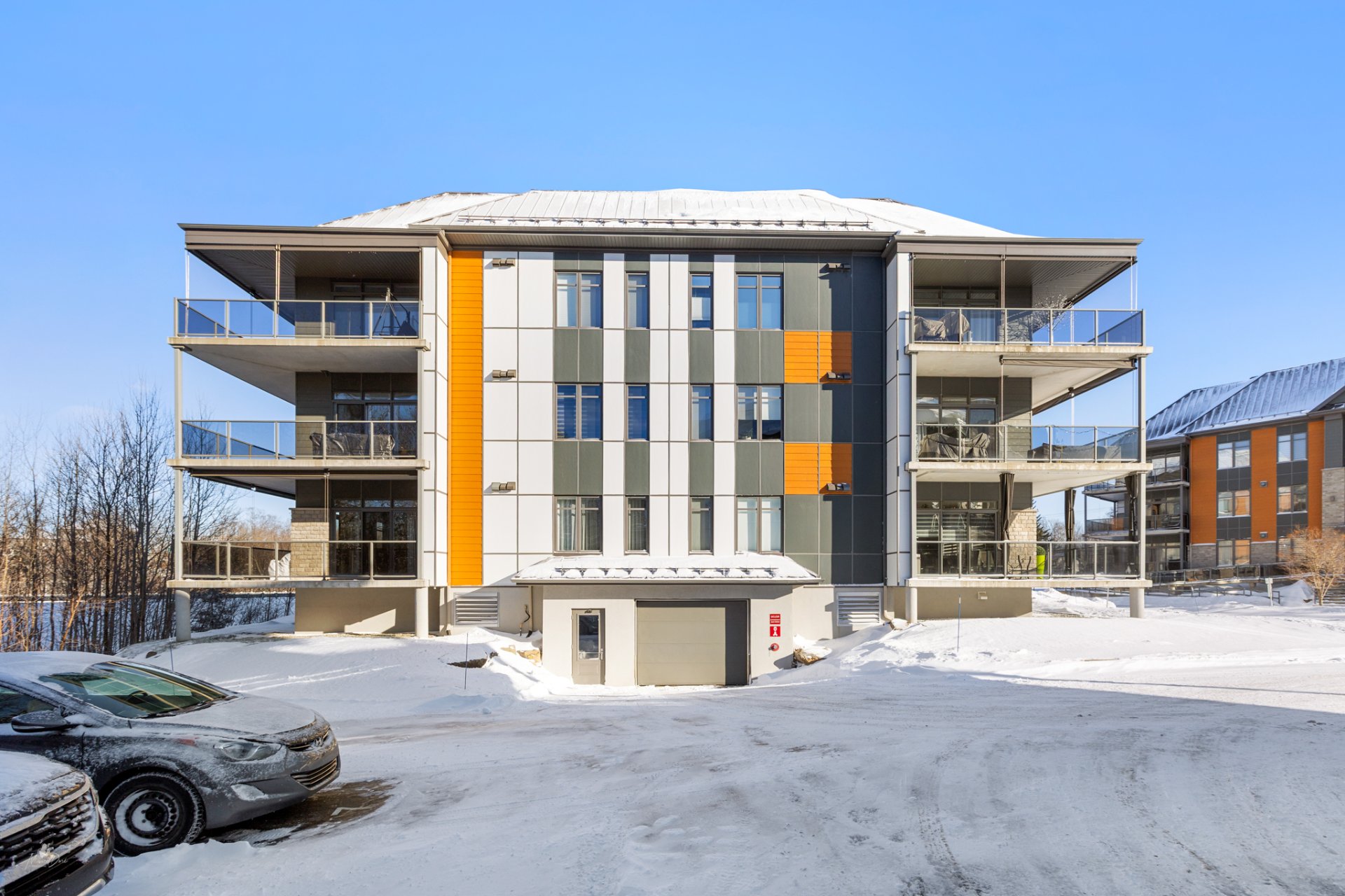 High-end condo on the 2nd floor, modern and bright, featuring an open-concept living space flooded with natural light and a beautiful view of the wooded area. Elegant kitchen with a large central island and propane fireplace in the living room. Spacious primary bedroom and a secondary bedroom with a Murphy bed, maximizing space and comfort. Luxurious bathroom with a freestanding bathtub and glass-and-tile shower, adjacent laundry room, convenient powder room, and optimized storage. Enjoy a private terrace, one garage parking space, and one outdoor parking space. Close to all amenities!