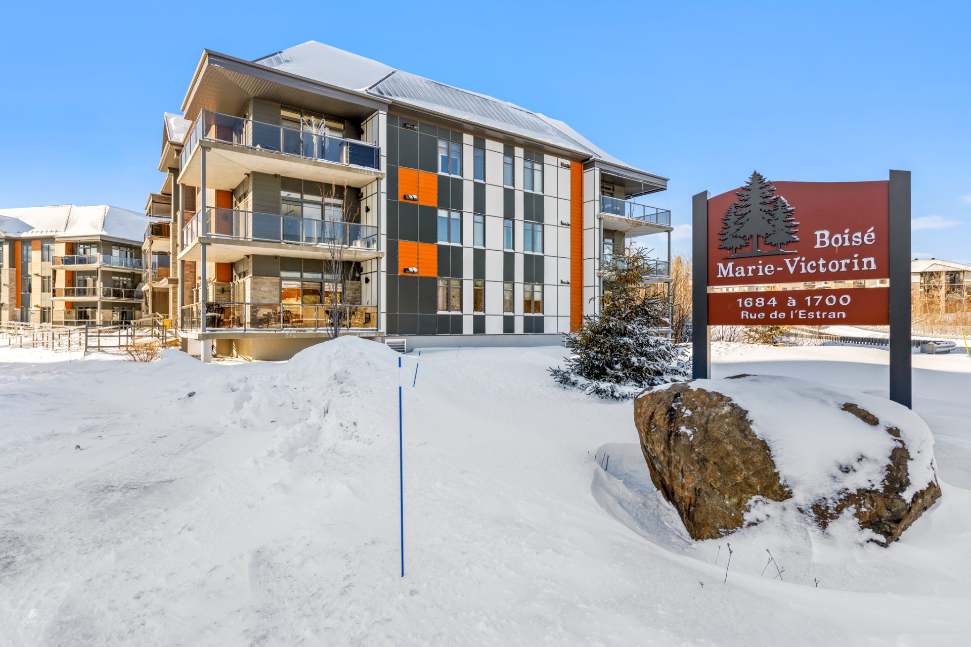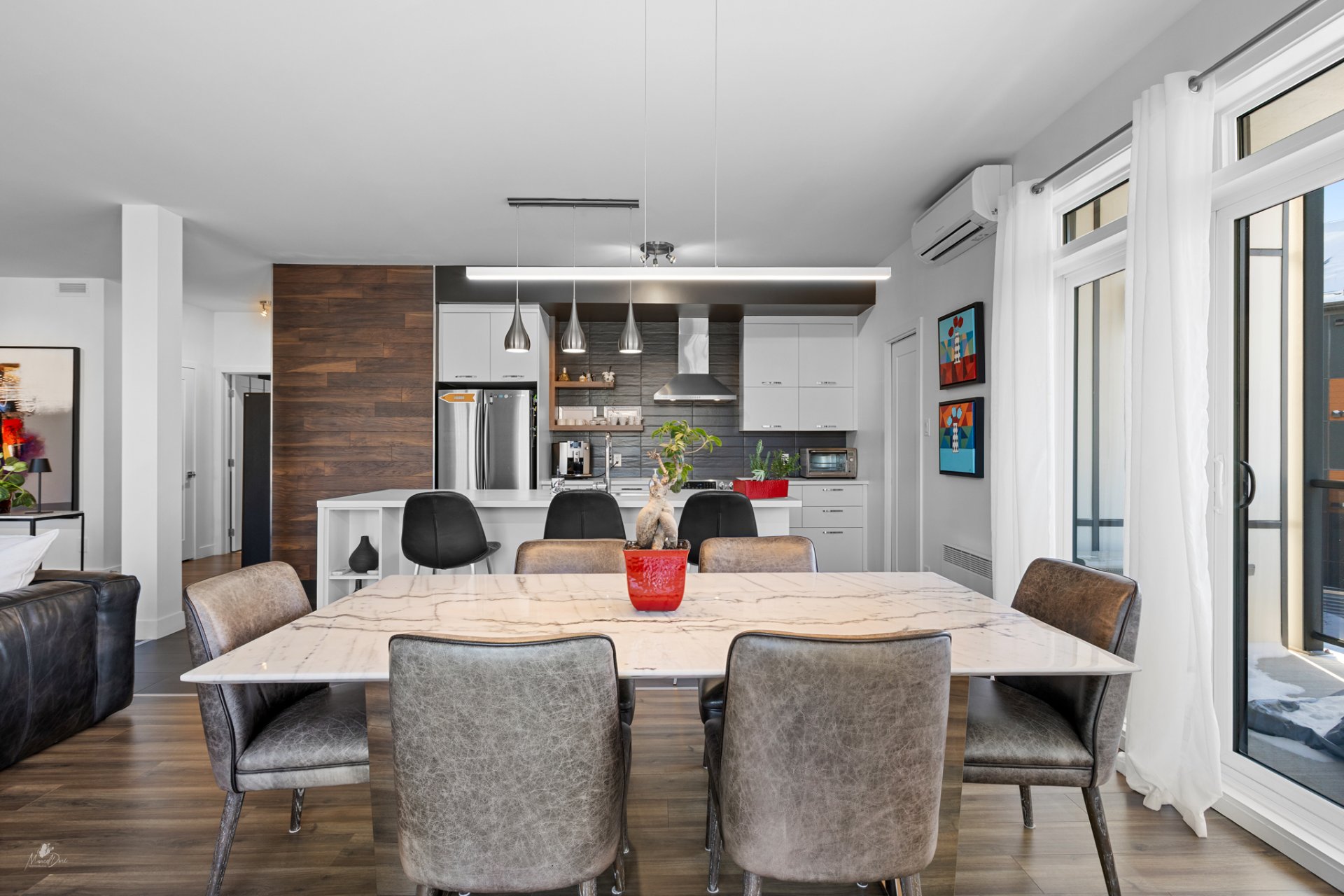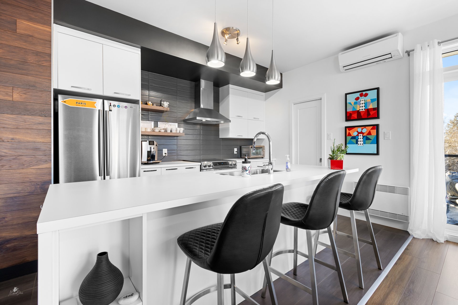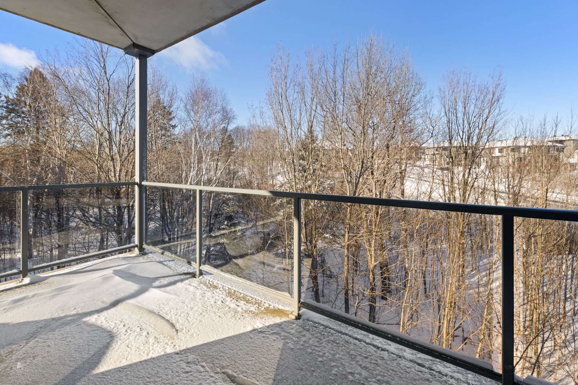 High-end condo on the 2nd floor, modern and bright, featuring an open-concept living space flooded with natural light and a beautiful view of the wooded area. Elegant kitchen with a large central island and propane fireplace in the living room. Spacious primary bedroom and a secondary bedroom with a Murphy bed, maximizing space and comfort. Luxurious bathroom with a freestanding bathtub and glass-and-tile shower, adjacent laundry room, convenient powder room, and optimized storage. Enjoy a private terrace, one garage parking space, and one outdoor parking space. Close to all amenities!
