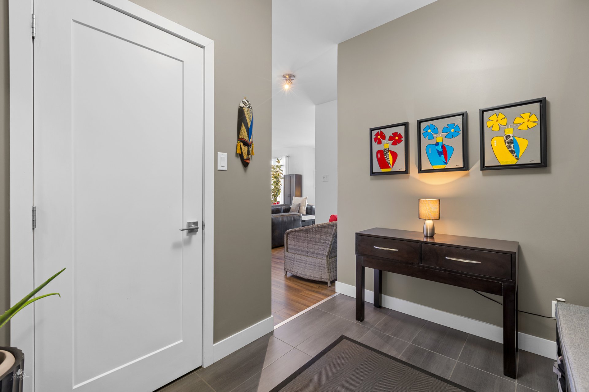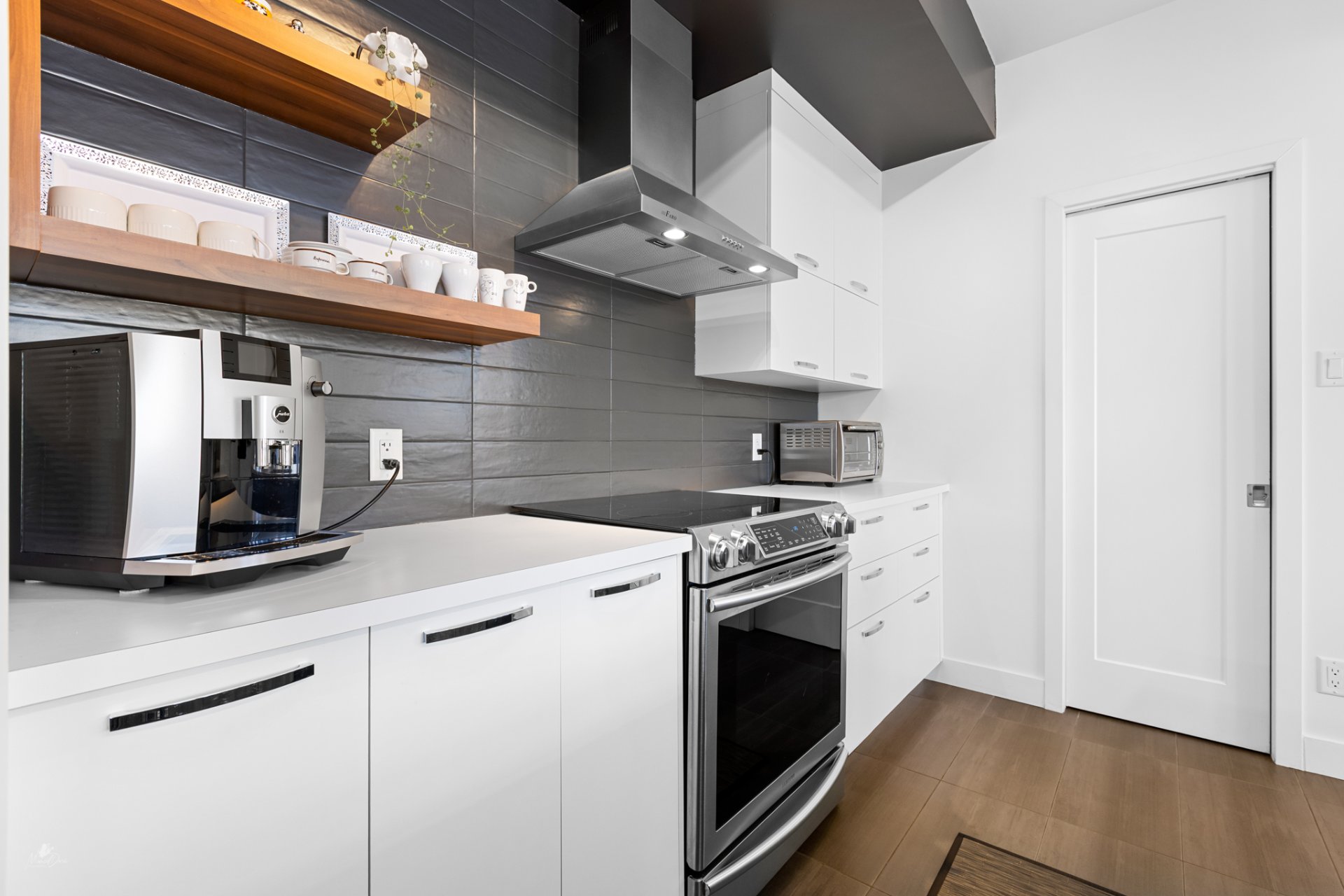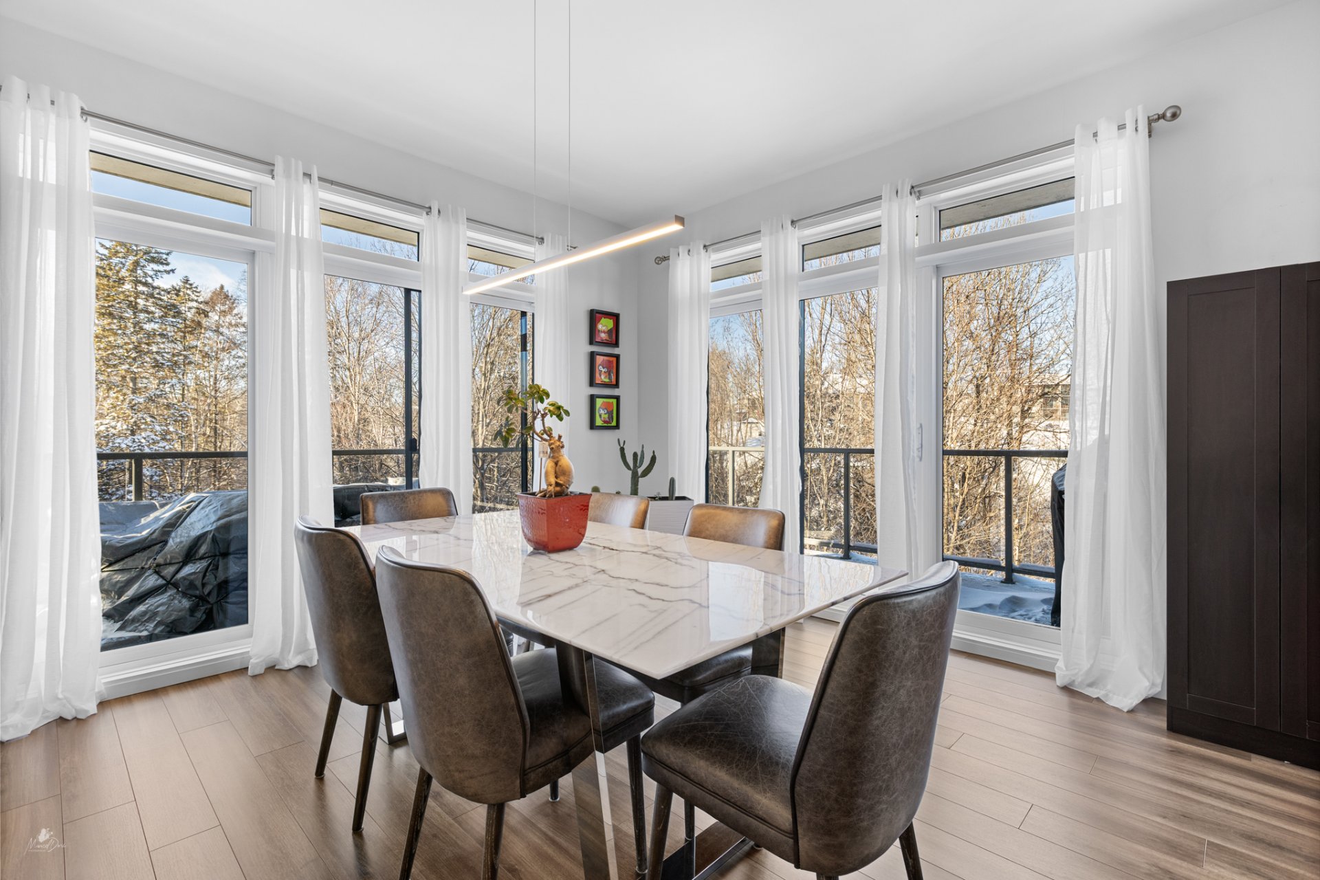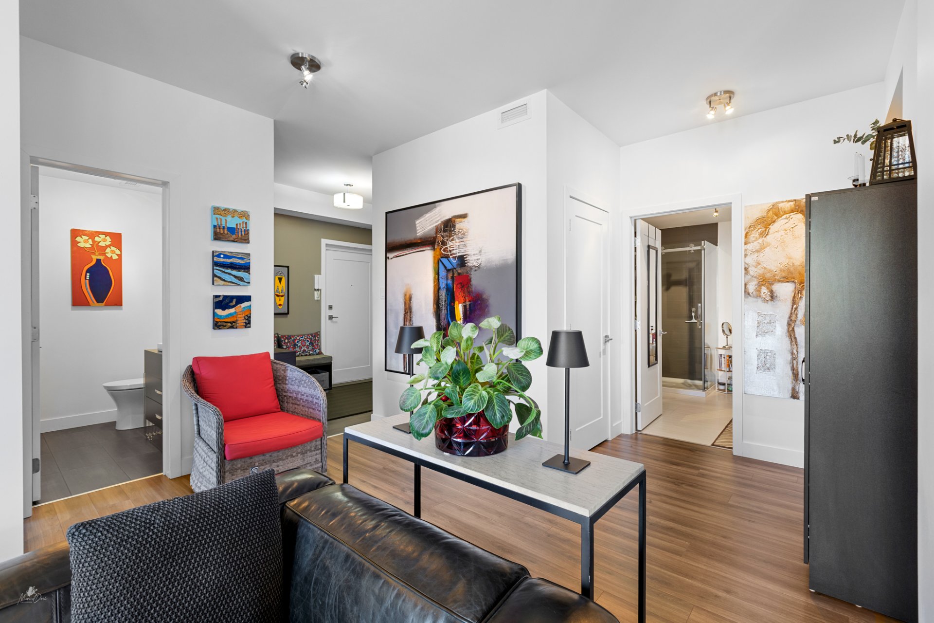 High-end condo on the 2nd floor, modern and bright, featuring an open-concept living space flooded with natural light and a beautiful view of the wooded area. Elegant kitchen with a large central island and propane fireplace in the living room. Spacious primary bedroom and a secondary bedroom with a Murphy bed, maximizing space and comfort. Luxurious bathroom with a freestanding bathtub and glass-and-tile shower, adjacent laundry room, convenient powder room, and optimized storage. Enjoy a private terrace, one garage parking space, and one outdoor parking space. Close to all amenities!