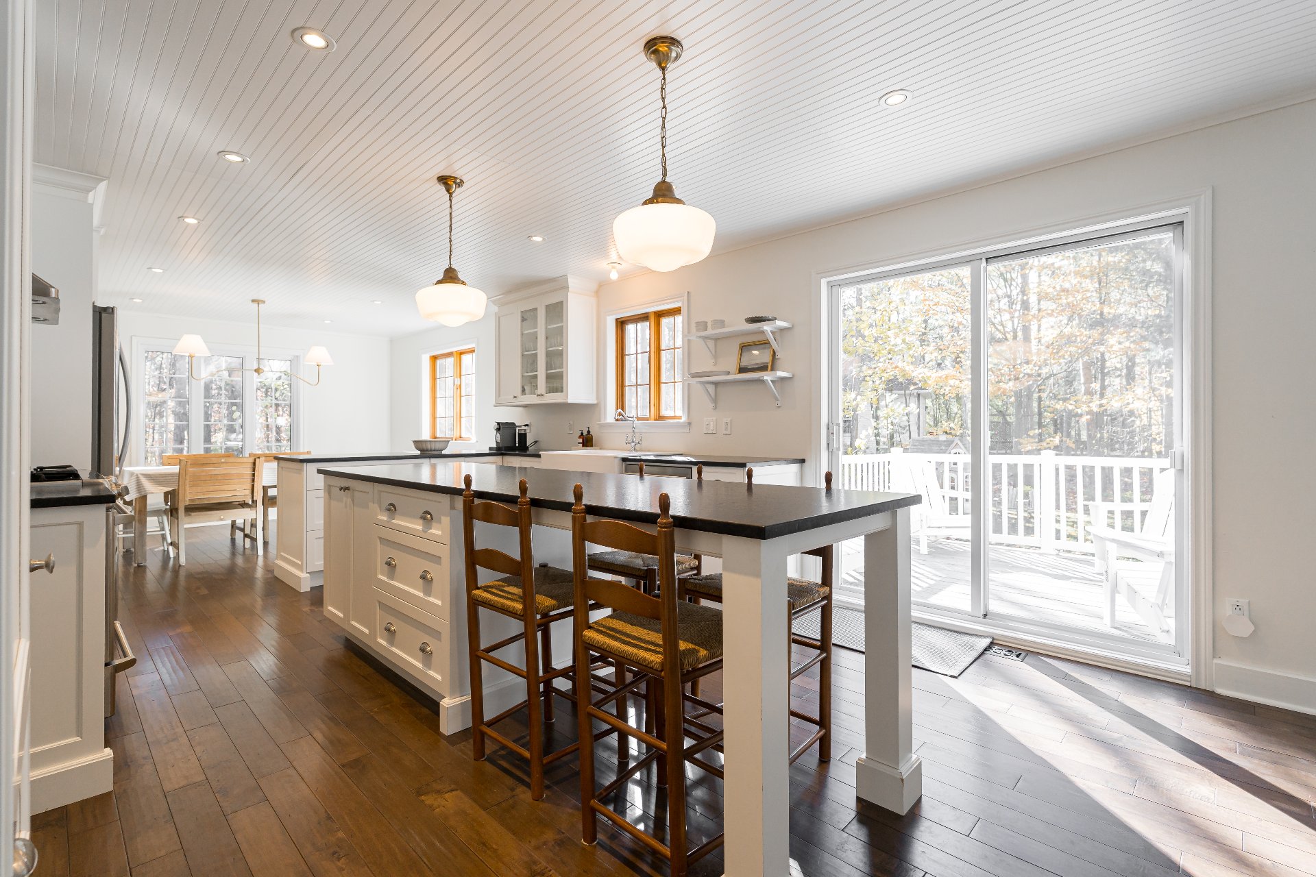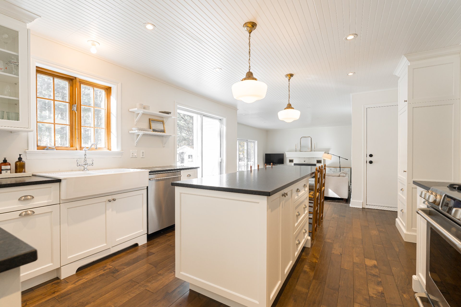 Updated kitchen with island, farmhouse sink, and lighting