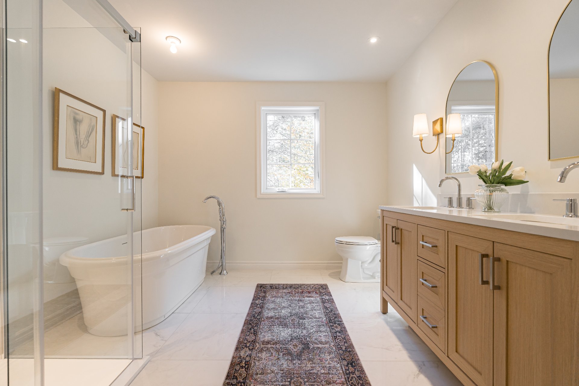 Ensuite features a freestanding tub, glass shower, and