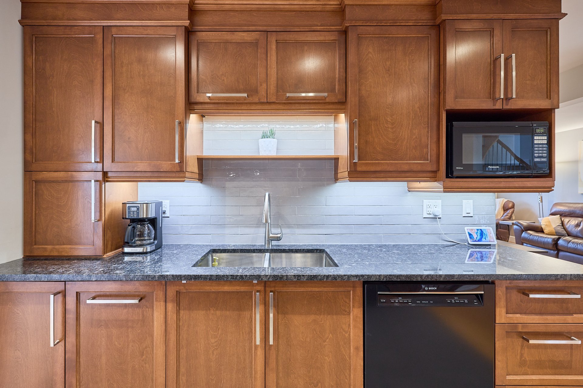 Kitchen with quartz countertops and wood cabinets