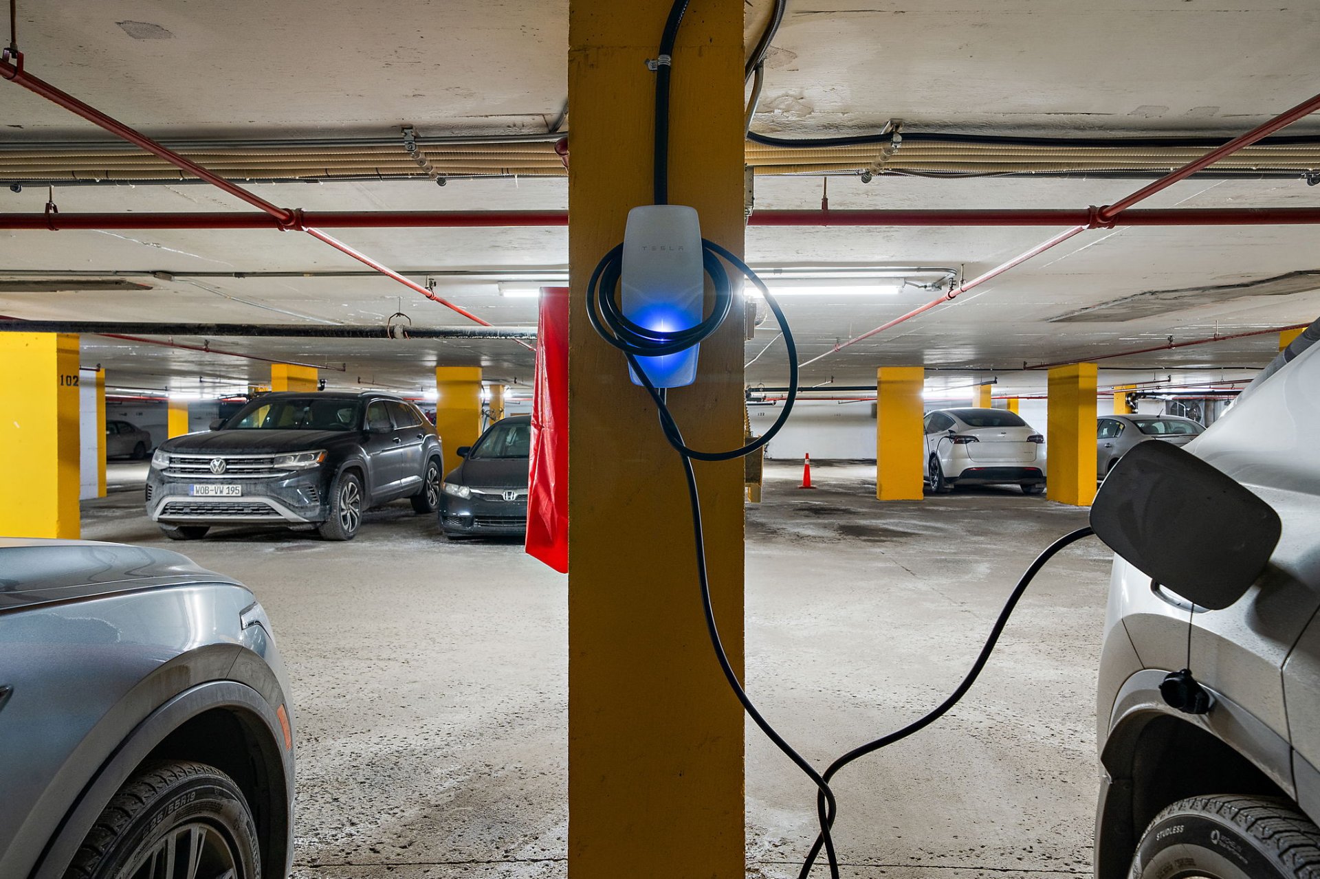 Un stationnement intérieur est inclus, en plus d'une borne