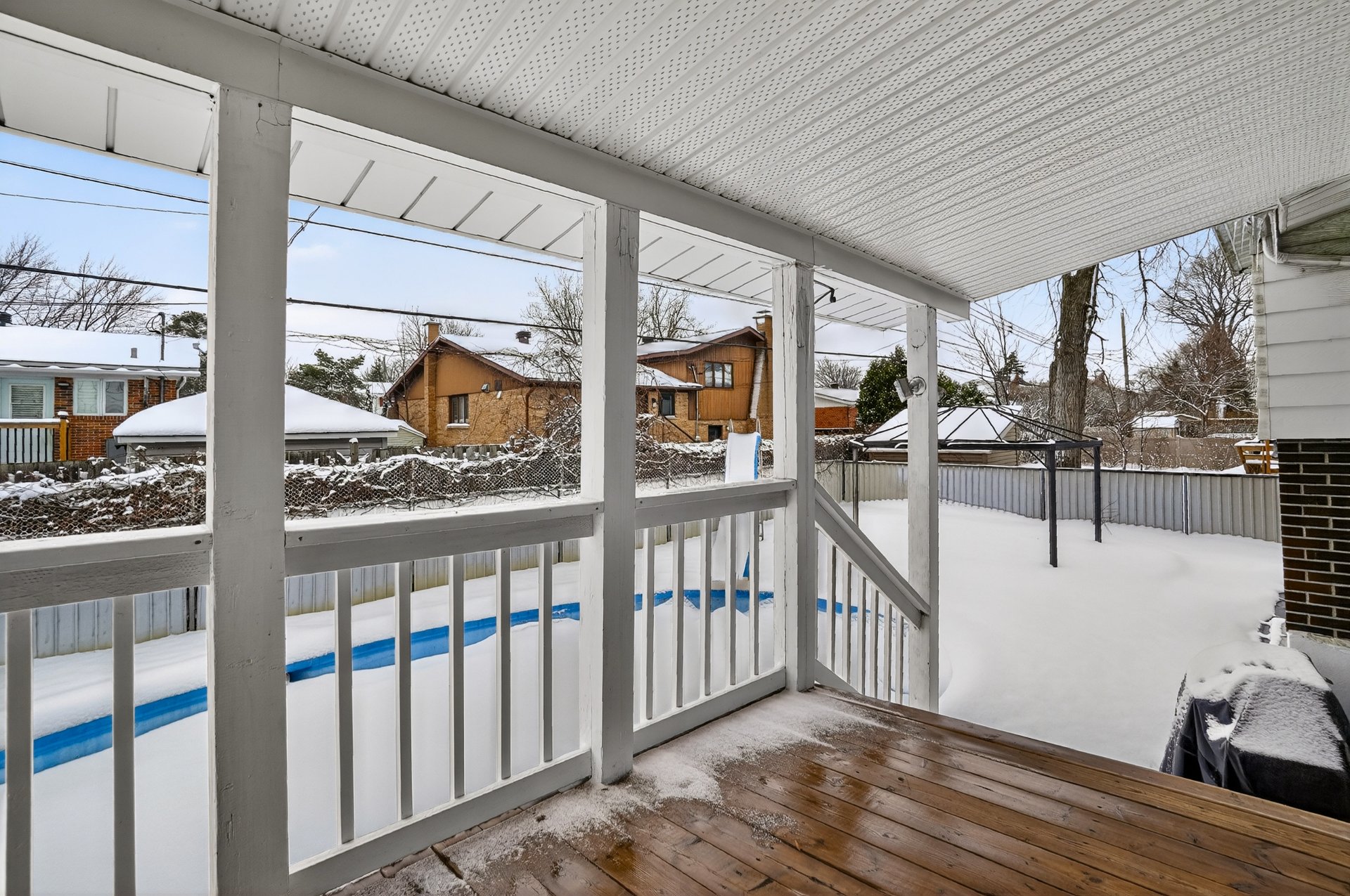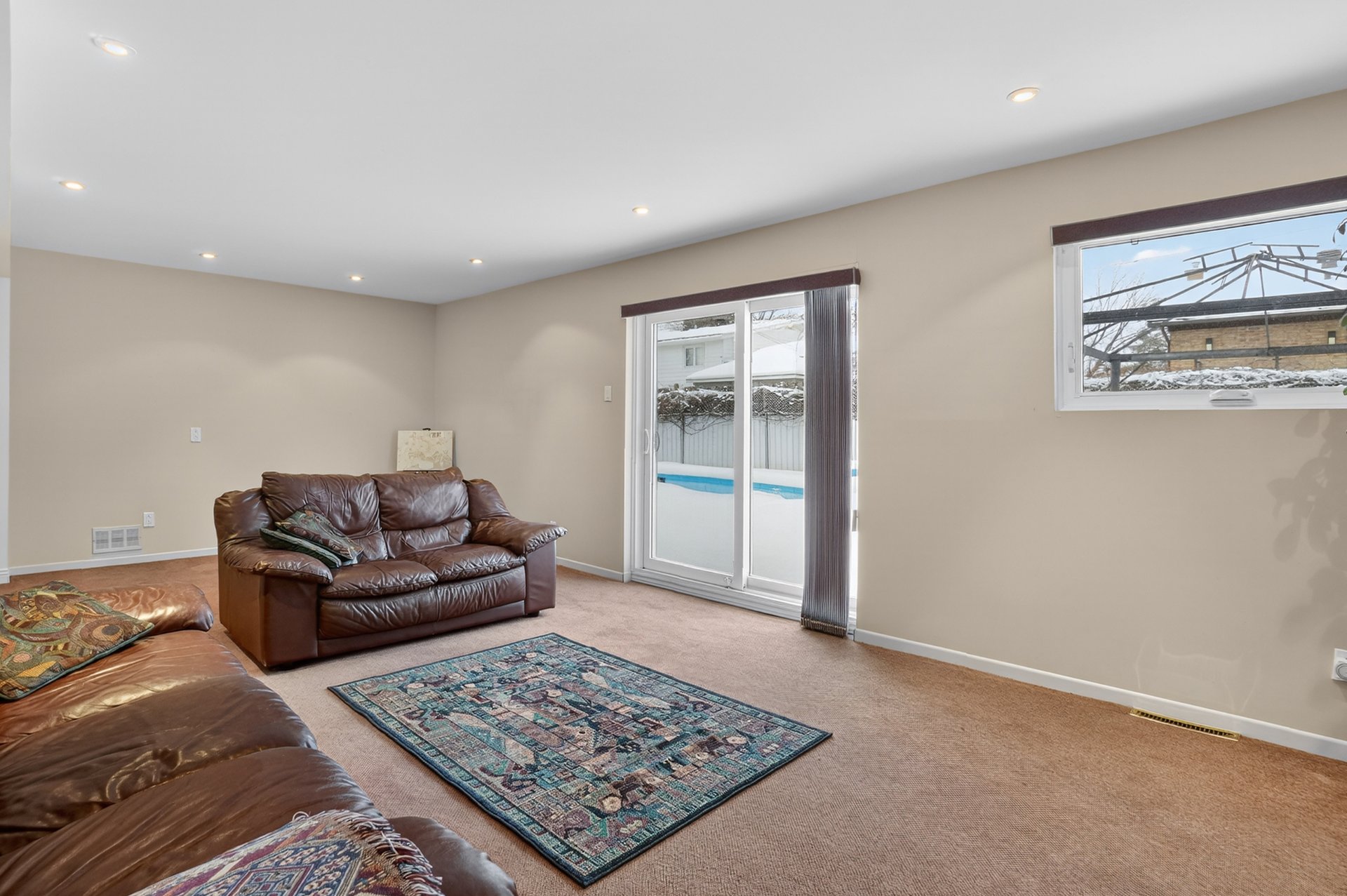 et à la piscine creusée. Parquet sous le tapis.