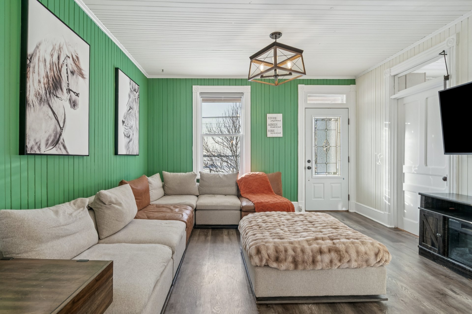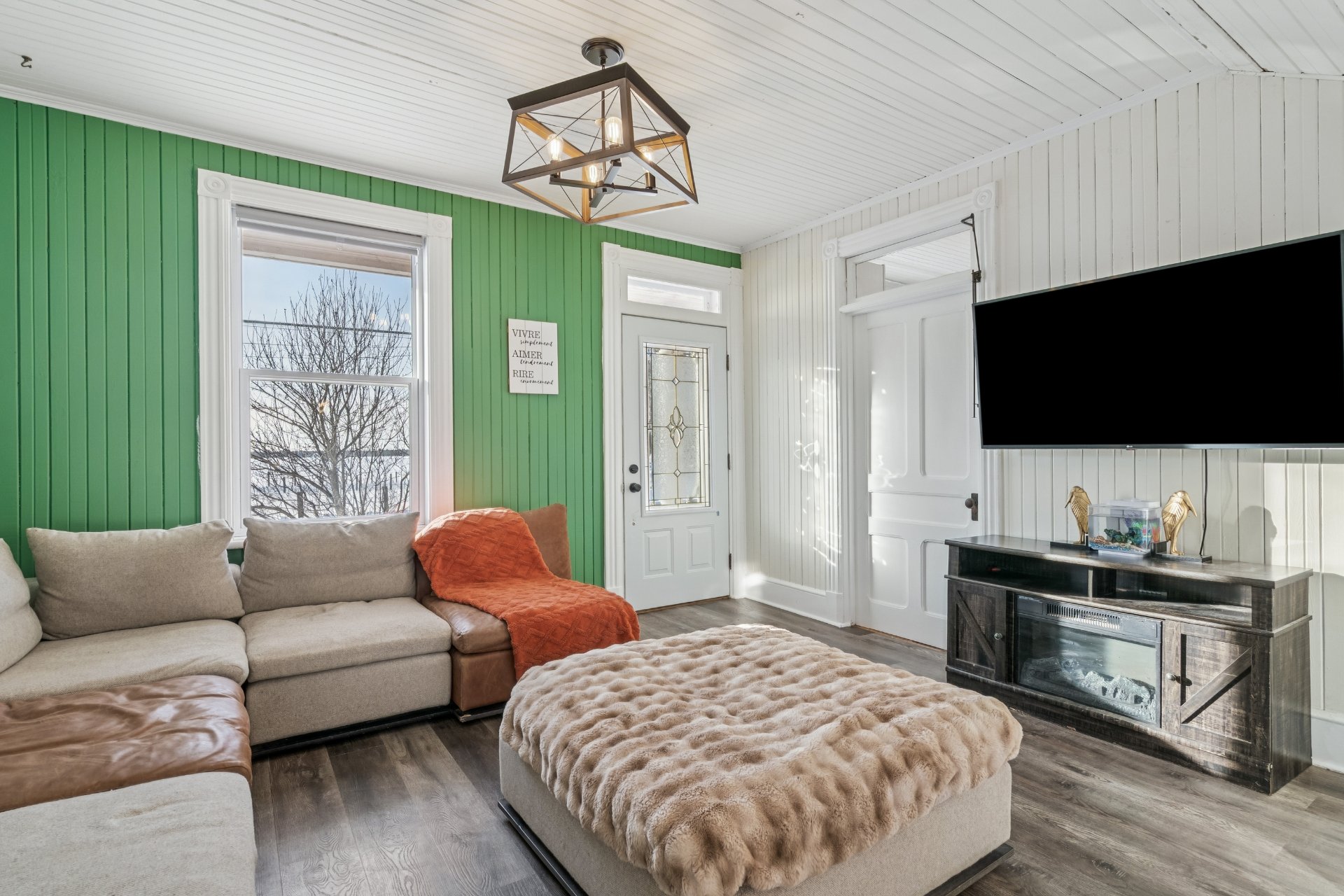*Salon : Plancher vinyle, murs vert et crème lambris,