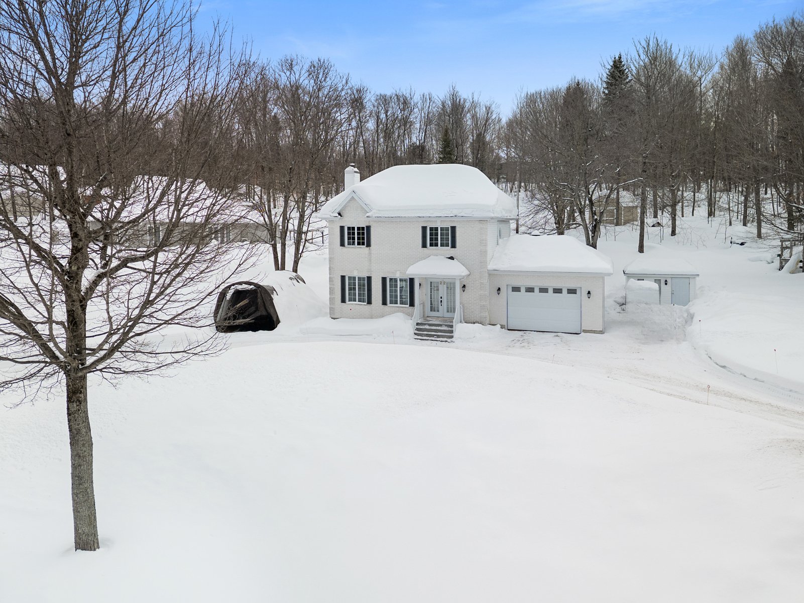 offre un terrain boisé avec rangement extérieur, le tout à