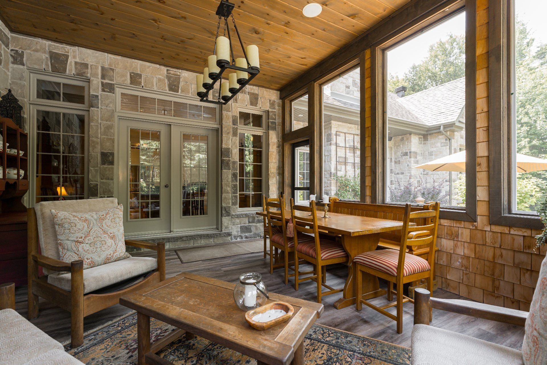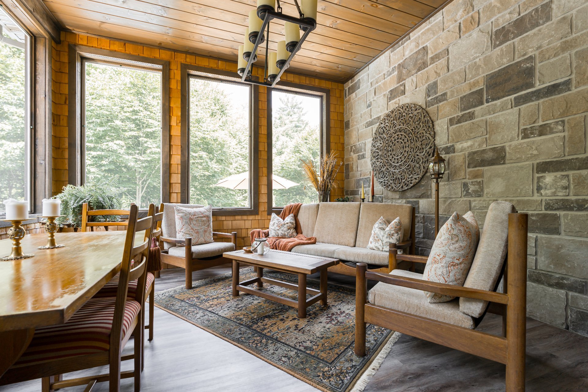 avec bardeaux de cèdre, plancher en vinyle et panneaux de