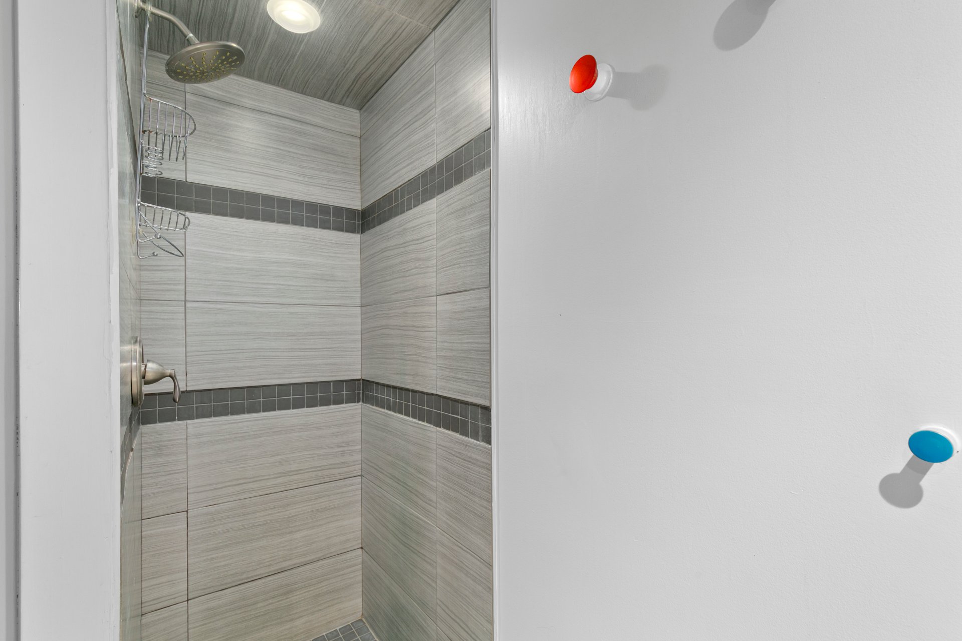 Douche vitrée en coin avec mur de céramique, tour multijets
