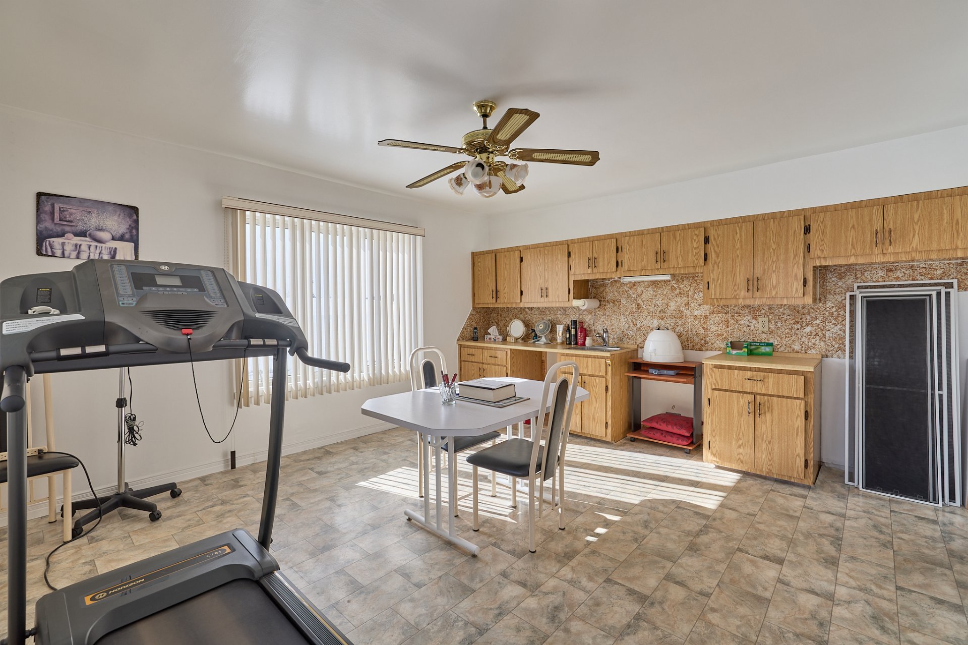 Cette demeure polyvalente offre cinq chambres à coucher,